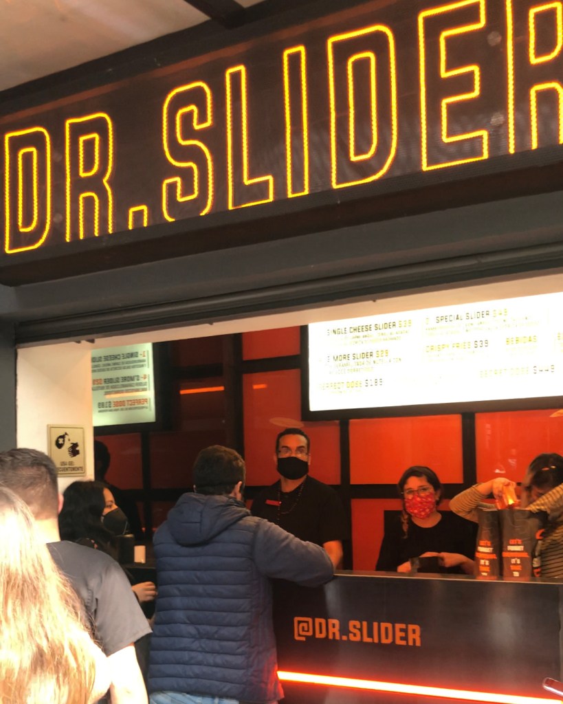 Al llegar a la caja, nos explicaron el concepto y sus productos: Dr. Slider vino del futuro para brindarnos pequeños bocados de felicidad y en su menú manejan 2 tipos de hamburguesa, unas papas, postre, bebidas y dos paquetes, el de para una persona y para dos. Así que escogimos este último.
