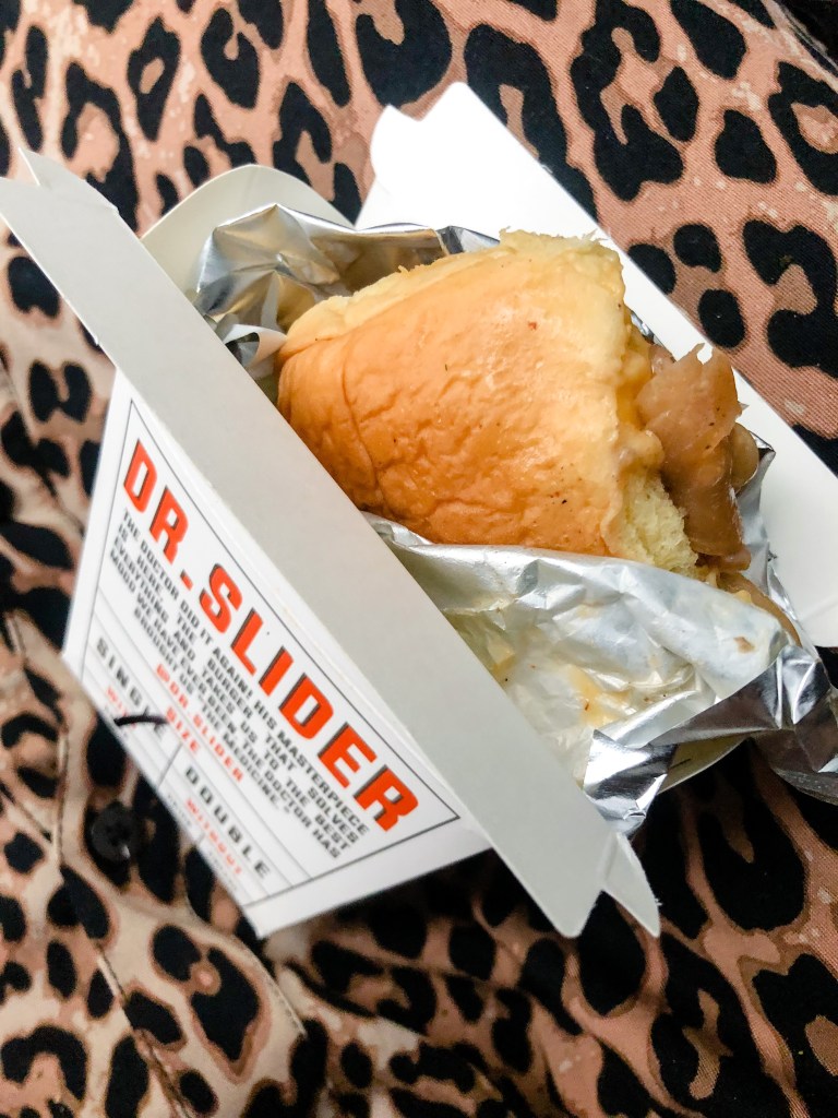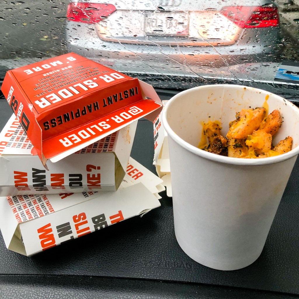 Debido a lo lleno del lugar, nos fuimos al coche a disfrutar tranquilamente de nuestros alimentos. Pusimos de nuestra música, abrimos esas hermosas cajitas blancas y rojas que olían a algo muy bueno, tan bueno que comenzamos a salivar, y a vivir la experiencia de sabor de Dr. Slider…
